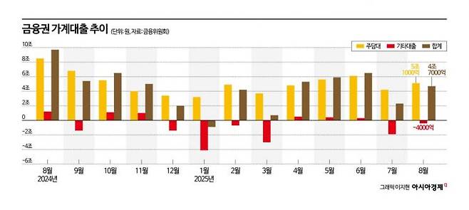 가계대출은 6·27 대책 이후 증가세가 둔화했으나 주택 관련 대출을 중심으로 여전히 증가 흐름이 이어지고 있다. 금융권 가계대출은 지난 7월 중 2조3000억원 증가하며 전월(6조5000억원) 대비 증가 규모가 큰 폭 축소했다가, 8월(4조7000억원)에는 5~6월 증가한 주택거래분이 시차를 두고 대출 실행으로 이어지면서 다시 늘어났다. 대출 종류별로는 주택 관련 대출 증가 규모가 7~8월(7월 4조2000억원·8월 5조1000억원)에도 2분기 수준을 소폭 밑도는 수준에서 증가 흐름을 이어가고 있다. 업권별로는 은행권과 비은행권 모두 7월 중 증가세가 크게 둔화했다가 8월에 일부 다시 확대되는 모습을 나타냈다.
