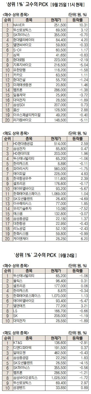 이날 미래에셋증권에 따르면 미래에셋증권 주식 거래 고객 중 최근 1개월간 투자 수익률 상위 1%에 해당하는 ‘주식 초고수’들이 오전 11시까지 가장 많이 사들인 종목은 네이버다.