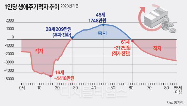 우리나라 국민은 28세에 흑자 인생에 들어서 45세에 정점을 찍은 뒤 61세부터 다시 적자 구간에 들어서는 것으로 나타났다.