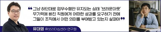 그러나 브라운아웃에 빠진 구성원은 여전히 정시에 출근하고, 마감일에 맞춰 결과물을 제출하며, 맡은 업무를 해낸다. KPI(핵심성과지표)만 놓고 그를 평가하면 정상 범위에 속하는 경우가 많다. 이 때문에 많은 리더는 “문제가 없다”라고 판단하고, 그에게 개입해야 할 필요성을 느끼지 못한다.