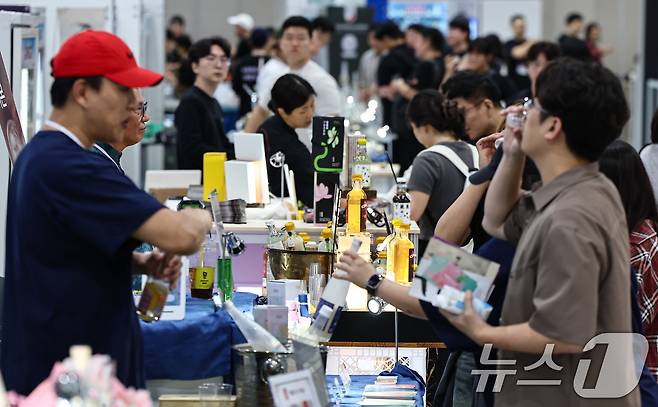 (서울=뉴스1) 김도우 기자 = 25일 서울 강서구 코엑스 마곡에서 열린 '서울국제주류&와인박람회'에서 관람객들이 전통주를 시음하고 있다. 2025.9.25/뉴스1