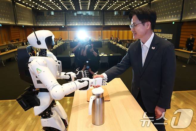 휴머노이드 로봇과 악수하는 김정관 장관