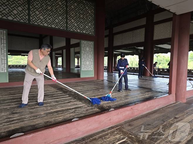 (서울=뉴스1) = 허민 국가유산청장(왼쪽)이 25일 오전 서울 종로구 경복궁에서 다가올 추석 연휴 관람객을 맞이하기 위해 국가유산청 직원들과 함께 전각 내 관람환경을 정비하고 있다. (국가유산청 제공. 재판매 및 DB 금지) 2025.9.25/뉴스1