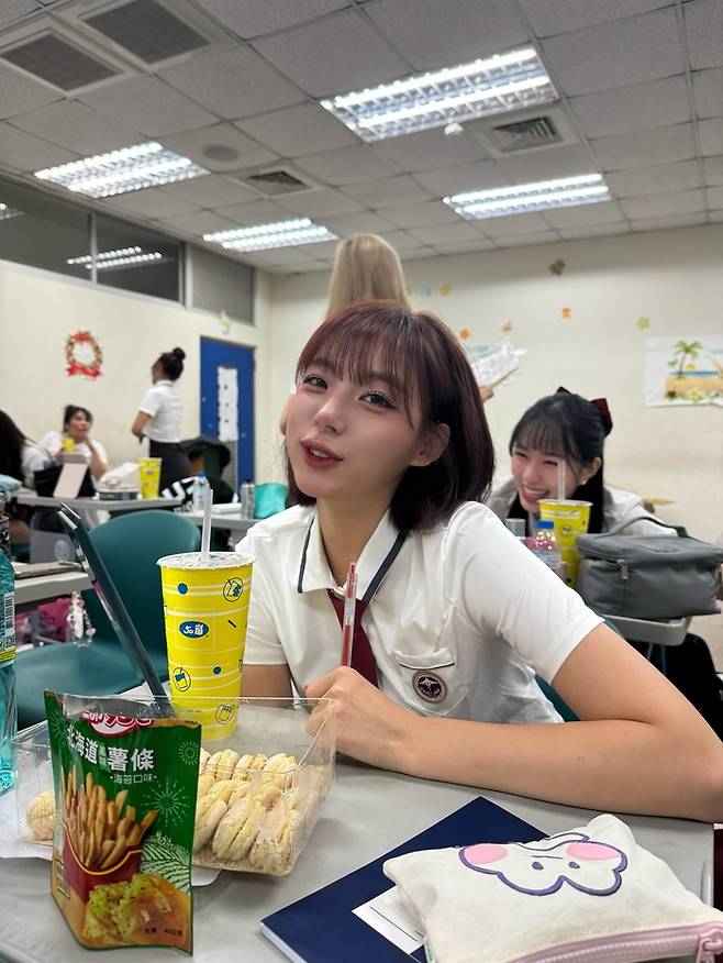 교실에서는 장난기 가득한 표정으로 간식을 먹는 밝은 모습이다.