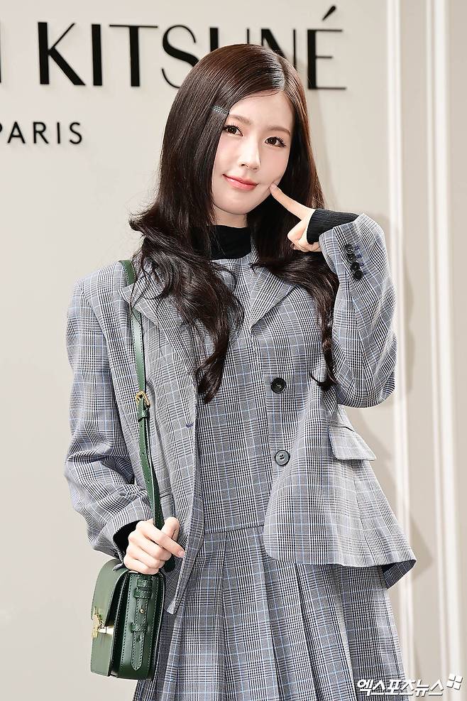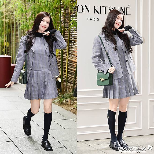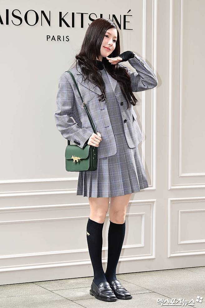 검은색 니삭스와 로퍼를 신어 단정하면서도 클래식한 느낌을 완성시켰다. 특히 힐이 없는 로퍼를 신었음에도 161cm라는 키를 무색케 할 정도로 완벽한 비율을 뽐냈다.