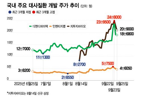 25일 업계에 따르면 디앤디파마텍과 인벤티지랩, 지투지바이오 등 국내 주요 비만 및 대사질환 신약 관련 기술을 보유한 기업들의 주가는 최근 3개월 새 저점 대비 평균 2배 이상 급등한 상태다. 각 사가 보유한 경구용 비만신약 후보 또는 장기지속형 기술의 상업화 성과 기대감이 배경이다.