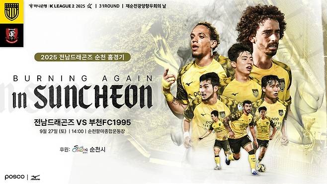 전남드래곤즈는 오는 27일 오후 2시 순천팔마종합운동장에서 열리는 하나은행 K리그2 2025 31라운드 홈경기에서 리그 3위 부천FC1995을 상대로 3위 탈환에 도전한다.