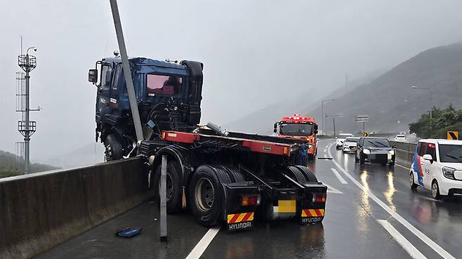 오늘(25일) 오전 9시 15분 경남 거제시 장평동 장평고개 인근 고가도로에서 통영 방향으로 달리던 20t 트레일러가 빗길에 미끄러지며 우측 난간을 들이받았습니다.