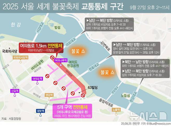 2025 서울세계불꽃축제가 개최되는 27일에는 오후 2시부터 오후 10시까지 서울 영등포구 여의동로 마포대교 남단~63빌딩 구간에 차량이 전면 통제된다. 여의나루로·국제금융로 등 5개 구역은 탄력적으로 교통이 통제될 계획이다. (그래픽=전진우 기자)