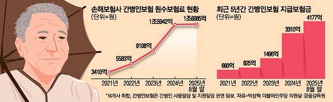 25일 박상혁 더불어민주당 의원이 금융감독원에서 제출받은 자료에 따르면 가입자가 입원 기간에 간병인을 고용하면 보험사가 간병인 사용일당을 지급하는 간병인보험을 판매하는 손해보험사는 2021년 10곳에서 2024년 16곳으로 늘었다. 같은 기간 원수보험료는 3410억원에서 지난해 말 1조5942억원으로 4년 만에 4.6배 불어났으며, 올해 8월 말 기준으로는 1조6085억원으로 급격한 성장세를 보이고 있다.
