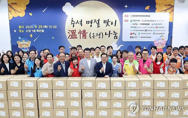 (대전=연합뉴스) 대전시 자원봉사연합회는 25일 사회공헌 협약을 맺은 지역 기업·기관·단체와 함께 '추석 명절맞이 온정나누기' 행사를 열고, 취약계층 400가구에 명절음식 키트를 전달했다고 밝혔다. 이장우 대전시장과 김영태 자원봉사연합회장을 비롯해 협약 기업 대표 및 임직원 등이 기념촬영을 하고 있다.2025.9.25 [대전시 제공. 재판매 및 DB 금지]