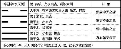 수괘는 기다림이니 기다려야 할 때 바르게 기다리면 때가 되어 감(坎)의 어려움이 해소되고 크게 형통을 득한다.