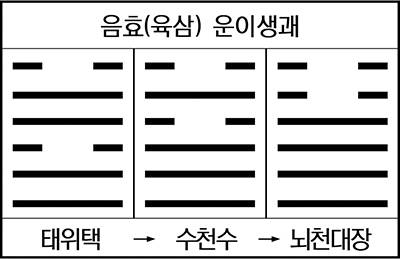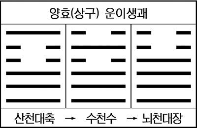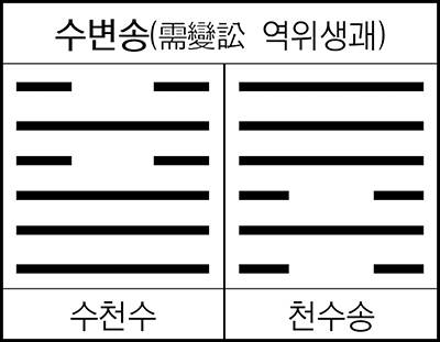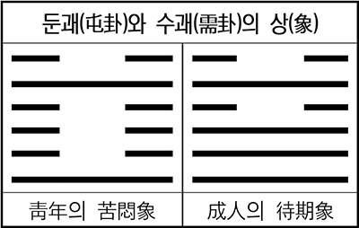 따라서 둔괘는 곤란이 앞을 가로 막고 있는 저돌적(猪突的)인 청년(震)의 고민이고, 수괘는 산전수전(山戰水戰)을 경험한 노련한 성인(乾)의 대기(待期) 자세라 할 수 있다.