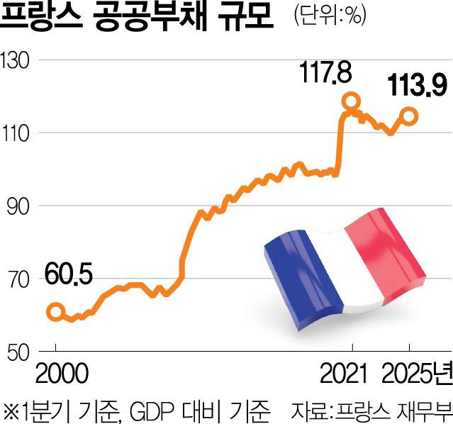 프랑스 통계청(INSEE)은 올해 2분기 말 기준 공공부채가 3조 4163억 유로(5621조 원)로 국내총생산(GDP) 대비 115.6%에 달했다고 25일(현지 시간) 밝혔다. 전 분기보다 709억 유로 증가했으며 GDP 대비 비율은 1.7% 포인트 상승했다.