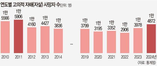 지난해 자살사망자 수가 1만4872명으로 집계되며 2011년 이후 13년 만에 가장 많았던 것으로 나타났다.
