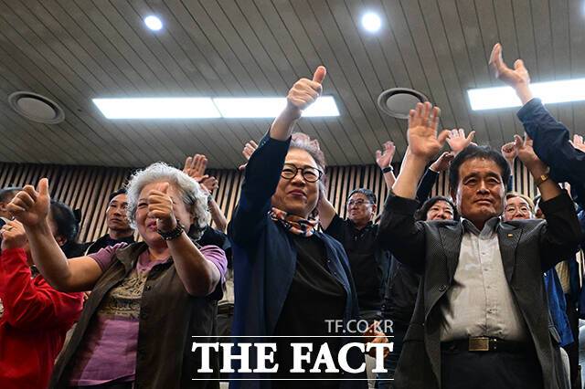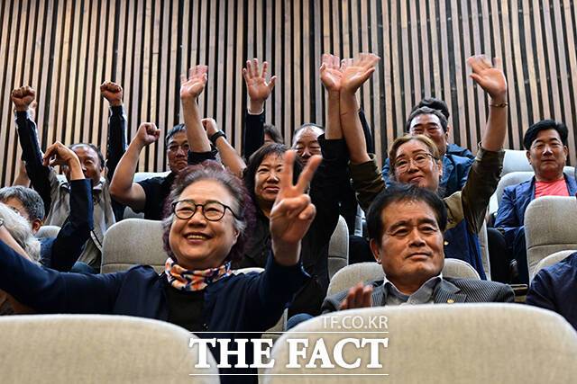 [더팩트ㅣ국회=남윤호 기자] 25일 오후 서울 여의도 국회에서 열린 본회의에서 경북·경남·울산 초대형산불 피해구제 및 지원 등을 위한 특별법안이 재석 218인에 찬성 213인, 기권 5인으로 가결되자 피해지역 주민들이 환호하고 있다.