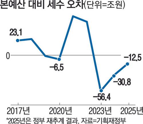 벌써 3년째 세수 결손이다. 세수 결손은 2023년 56조4000억원, 2024년 30조8000억원 등 2년간 87조2000억원에 달한다. 올해 12조5000억원까지 합치면 99조7000억원으로 100조원에 육박한다.