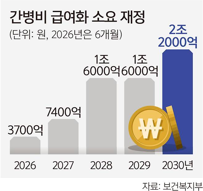 복지부의 간병비 급여화 추진방향에 따르면 정부는 내년 하반기부터 5년간 6조5000억원을 투입해 요양병원 간병비 부담을 완화하기로 했다. 현재 건강보험 비급여 항목으로 개인이 100% 지불하는 간병비를 2030년까지 30% 안팎으로 줄인다. 내년 하반기 요양병원 200곳을 시작으로 2030년까지 의료중심 요양병원 500곳을 선정해 8만여명의 간병비 부담을 덜어준다는 계획이다.