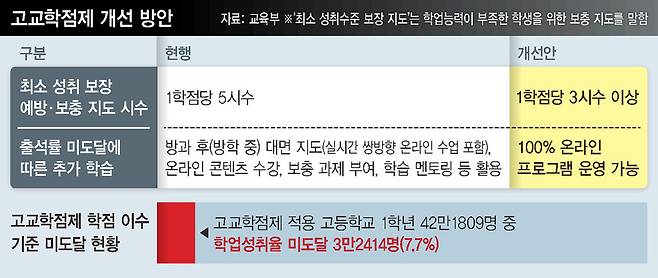 이날 교육부가 대책 발표와 함께 공개한 ‘올해 1학기 학점이수 기준 미도달·미이수 현황’에는 그 실적이 잘 담겨 있다. 이를 보면, 전국 고교 2429교, 1학년 4만21809명 가운데 출석률과 학업성취율이 일정 기준에 미치지 못하는 학생을 뜻하는 ‘최소 성취수준 미도달 학생’은 전체의 7.7%인 3만2414명이었다. 이들 중 대부분은 최성보 제도에 따라 예방·보충 수업을 받아 과목 이수에 성공했다. 학점 이수에 실패한 학생은 2489명(0.6%)에 그친다. 최소 성취수준 미도달 학생 10명 중 9명은 현장 교사들의 지도와 보충 수업에 따라 학력을 끌어올렸다는 뜻이다.