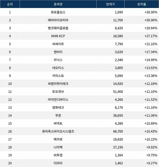 이어 상승률 2위 에이아이코리아(364950)는 주가가 +30.00% 폭등하며 종가 11,700원에 상승 마감했다. 상승률 3위 뱅크웨어글로벌(199480)의 주가는 8,420원으로 +29.94% 폭등하며 강세를 보였다. 상승률 4위 NHN KCP(060250)는 +27.17% 상승하며 18,580원에 마감했다. 상승률 5위 씨싸이트(109670)는 +22.10%의 급등세를 타고 종가 7,790원에 마감했다.