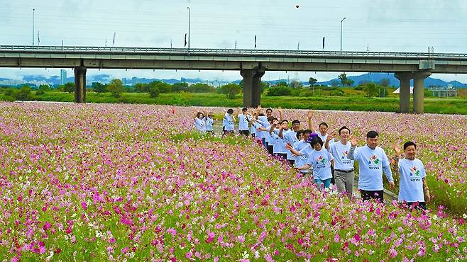 | 25일 나주시 영산강 둔치에서 나주시청 직원들과 시민들이 코스모스가 핀 산책길을 걸으며 나주영산강축제를 홍보하고 있다. 2025 나주영산강축제는 1억송이의 코스모스가 핀 28만㎡ 영산강 둔치를 비롯한 영산강 정원 일원에서 10월8일부터 12일까지 닷새간 열린다./김애리 기자·조영권 인턴기자 |
