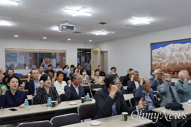 | ▲ 대구시민헌법학교 주최로 25일 대구생명평화의집에서 열린 특강에서 참가자들이 '뉴라이트 세력 척결하자'며 구호를 외치고 있다. |