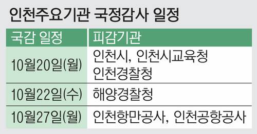 올해 국정감사에서 인천시를 비롯해 인천시교육청·인천경찰청·해양경찰청·인천항만공사·인천공항공사 등이 피감기관에 포함됐다. 인천 특수교사 사망 사건, 해루질 노인을 구조하다 숨진 고(故) 이재석 경사 사건 등이 이번 국감 주요 사안으로 다뤄질 전망이다.