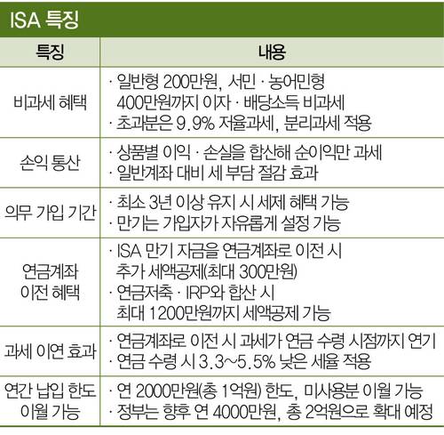 ISA는 하나의 계좌에서 국내 상장 주식, 상장지수펀드(ETF), 펀드, 리츠(부동산투자회사), 예·적금 등의 금융상품에 투자하며 세제 혜택을 받을 수 있는 상품이다. 비과세 혜택, 손익 통산(상품별 수익을 통합·계산해 손익을 따짐), 만기 시 자금을 연금 계좌로 이전하면 추가 세액공제 혜택을 주는 등 이점이 많아 ‘만능 통장’이라는 별명이 붙었다.