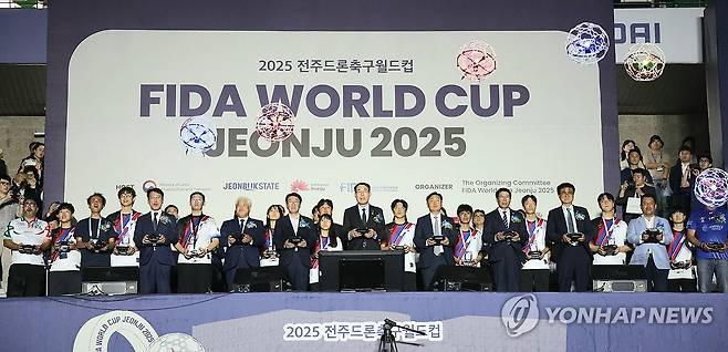 (전주=연합뉴스) 25일 전북 전주월드컵경기장에서 세계 최초 드론축구월드컵인 '2025 전주드론축구월드컵(FIDA World Cup Jeonju 2025)'의 개막식이 열리고 있다. 오는 28일까지 '드론축구, 하늘을 열고 세계를 잇다'를 슬로건으로 열리는 이번 대회에는 33개국 1천600여명의 선수단이 참가한다. 2025.9.25 [전주시 제공. 재판매 및 DB 금지]