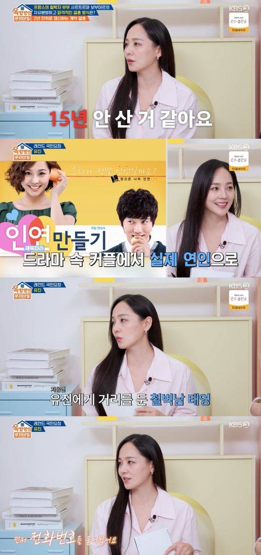 25일 방송된 KBS 2TV 예능 '옥탑방의 문제아들'(이하 '옥문아')에서는 배우 유진이 출연해 결혼 15년 차 유진, 남편 기태영과 첫 만남부터 연애, 그리고 결혼까지 러브스토리를 공개했다.