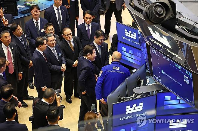 (뉴욕=연합뉴스) 한상균 기자 = 이재명 대통령이 25일(현지시간) 미국 뉴욕 증권거래소를 방문해 관계자의 설명을 들으며 객장을 둘러보고 있다. 2025.9.25
