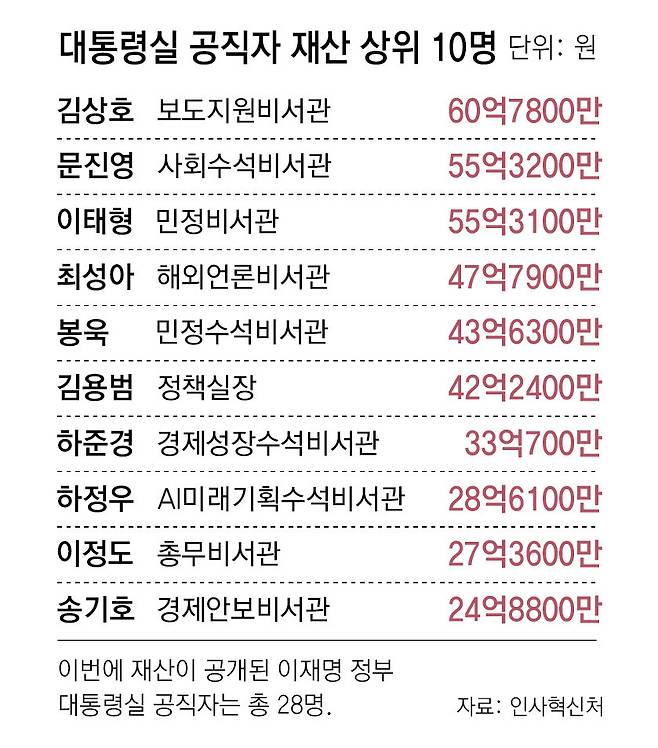 이재명 정부 대통령실의 고위공직자 28명의 재산이 처음 공개됐다. 이들은 평균 23억2500만 원의 재산을 보유한 것으로 집계됐다. 이날 재산 공개 대상은 6월 2일부터 7월 1일 사이 임명된 고위공직자로 대통령실에선 28명이 포함됐다. 국회의원 신분으로 정기등록재산을 올해 한 차례 공개한 이 대통령과 강훈식 비서실장, 위성락 국가안보실장, 강유정 대변인은 제외됐다.