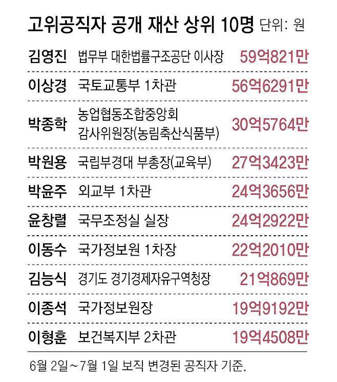 이재명 정부에서 임명된 장관급 공직자는 이번에 재산이 공개되지 않았다. 올 6월 2일부터 7월 1일 사이 새로 임명되거나 퇴직한 공직자가 공개 대상이었는데, 이 기간 새로 임명된 장관급 공직자가 없었기 때문이다. 법관 재산은 대법원 공직자윤리위원회가 별도로 집계한다.