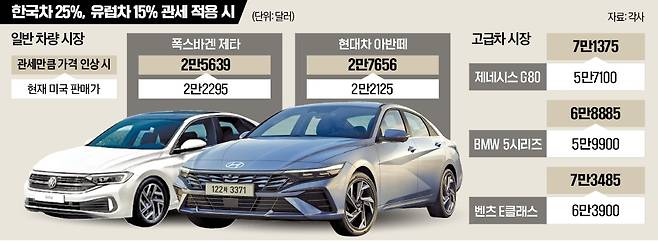 관세를 모두 반영하면 가격 역전 현상까지 발생할 수 있다. 현재 현대자동차 아반떼(현지명 엘란트라)의 미국 시장 가격은 2만2125달러(약 3098만원)로, 준중형 세단 시장의 경쟁자인 폭스바겐 제타(2만2295달러)보다 3.9% 저렴하다. 하지만 한국(25%)과 유럽(15%)에 부과되는 관세를 전부 가격에 반영하면 아반떼(2만7656달러)가 제타(2만5639달러)보다 7.7% 비싸진다.