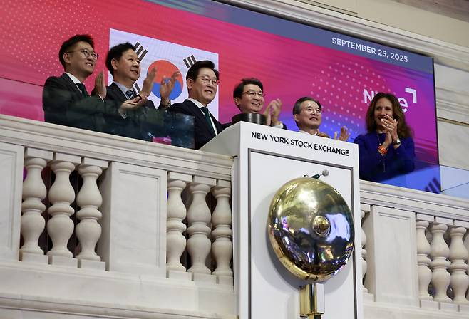 | ▲ 이재명 대통령이 25일(현지시간) 미국 뉴욕 증권거래소에서 개장을 알리는 버튼을 누른 뒤 박수를 치고 있다. 오른쪽은 린 마틴 뉴욕증권거래소 회장. |