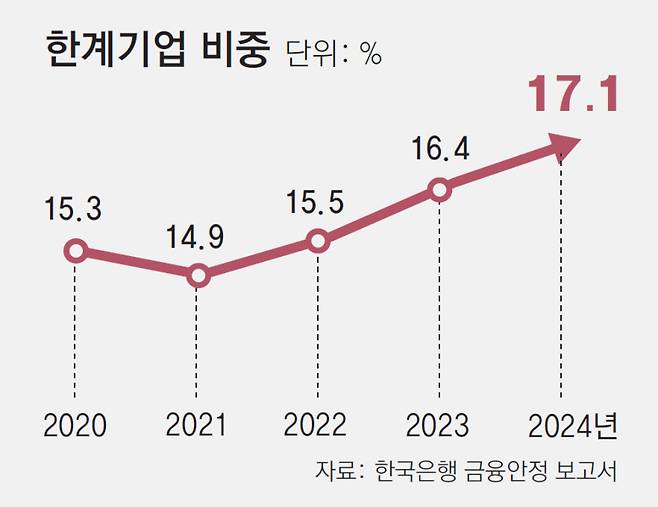 대출이자를 감당하지 못하는 한계기업 비중이 14년 만에 최고치를 찍었다.