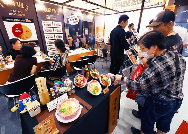 25일 서울 강남구 코엑스에서 열린 ‘2025 IFS 프랜차이즈 창업·산업 박람회’를 찾은 방문객들이 창업 상담을 받고 있다. 27일까지 열리는 이 박람회는 예비 창업자와 가맹본사를 연결하는 ‘창업전’과 매장 운영에 필요한 설비와 서비스를 제공하는 ‘산업전’으로 구성됐다.