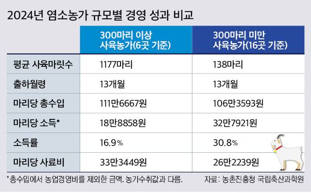 배 연구사는 대농이 중소농보다 오히려 소득률이 낮았다고 설명했다. 그에 따르면 300마리 이상 사육농가의 지난해 염소 1마리당 총수입은 111만6667원이었고, 1마리당 소득(총수입에서 농업경영비를 제외한 금액)은 18만8858원이었다. 그러나 300마리 미만 사육농가는 1마리당 총수입이 106만3593원으로 대농 대비 4.8% 낮았지만 1마리당 소득은 32만7921원으로 1.7배 높았다.