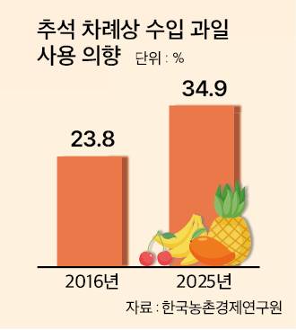 더욱이 농경연 조사에선 차례상에 수입 과일을 올리겠다는 답변이 크게 늘어난 것으로 나타나 충격을 주고 있다. ‘추석 차례상에 수입 과일을 올릴 의향이 있다’는 응답은 34.9%로 9년 전인 2016년(23.8%) 대비 11.1%포인트 뛰었다.