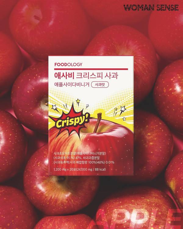 2 푸드올로지 애사비 크리스피 하루 한 포 씹어 먹는 크리스피 형태의 간식으로 100% 유기농 영국산 애플사이다비니거를 첨가물 없이 초모 성분 40%를 압축한 캔디 타입 제품이다. 식초 특유의 신맛 부담을 줄이고 섭취 편의성을 높여 애플사이다비니거 초심자에게 추천.