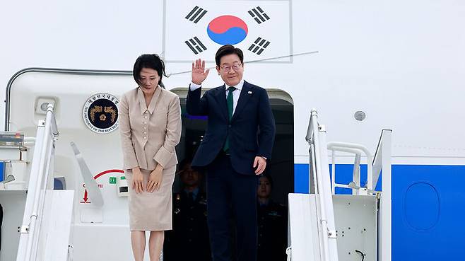 ▲ 미국 방문 일정을 마친 이재명 대통령과 김혜경 여사가 25일(현지시간) 뉴욕 JFK공항 공군 1호기에서 인사하고 있다.