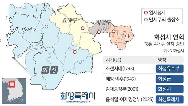 인구 105만의 화성특례시가 내년 2월 ‘4개 일반구’ 체제로 전환된다. 25일 시에 따르면 화성시 면적은 서울의 1.4배인 844㎢이다. 북쪽으로 수원·안산·시흥시와 접하고 남쪽으론 오산·평택시와 붙어 있다. 동쪽은 용인시, 서쪽은 서해다. 이곳에 기업 연구소와 반도체·자동차·바이오·관광산업을 아우르는 시설들이 들어서면서 평균 연령 30대 후반의 미래 지향 도시가 조성됐다.