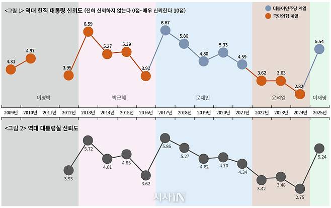 2025년 〈시사IN〉 신뢰도 조사 결과 이재명 대통령 신뢰도가 10점 만점에 5.54점으로 주요 정치인 가운데 가장 높았다. 현직 대통령 신뢰도가 5점을 넘은 건 2020년 문재인 전 대통령(5.33점) 이후 처음으로, 지난해 2.82점이라는 ‘역대 최저’를 찍은 윤석열 전 대통령과 비교하면 2.72점이나 급상승한 수치다. 계엄과 탄핵으로 무너진 신뢰가 이재명 정부 들어서 차츰 복원되고 있는 것으로 보인다.
