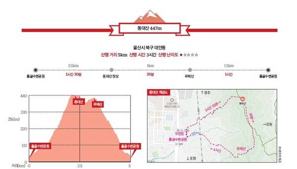 동대산은 울산시 북구 사람들에게 아주 유용한 산이다. 마을에서 정상까지 거리가 가까운 편이라 쉽게 오간다. 접근하기 쉬운 한편 곳곳에서 근사한 조망을 선사하기까지 한다. 정상에 설치된 데크에서 영남알프스 능선을 한눈에 볼 수 있고, 뒤쪽으로 가면 동해안이 훤하다. 일출과 일몰을 한 곳에서 볼 수 있다.