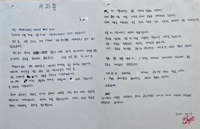 지난 6월 29일 김포 솔터축구장에서 열린 김포FC-인천 유나이티드 경기 종료 직후 발생한 팬 폭력 사건의 가해자인 인천 팬 A씨가 피해자 B씨와 그의 가족, 김포 구단에 공개 사과했다.