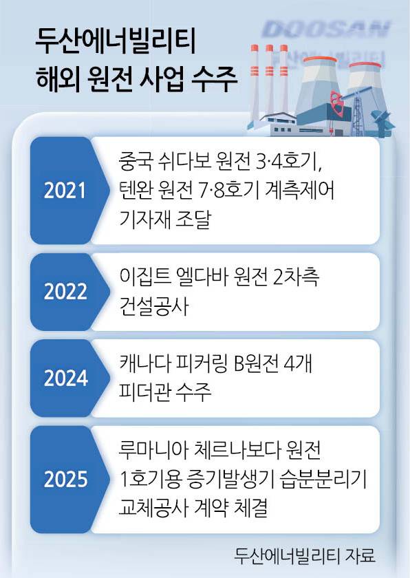 두산에너빌리티는 해외에서 원전 사업을 꾸준히 수주하고 있다. 지난해에는 캐나다 캔두에너지로부터 캐나다 피커링 B원전 4개 피더관 수주에 성공했다. 이외에도 ▷2022년 이집트 엘다바 원전 2차측 건설공사 ▷2021년 중국 쉬다보 원전 3·4호기, 텐완 원전 7·8호기의 계측제어 기자재 조달 등을 수행한 바 있다.