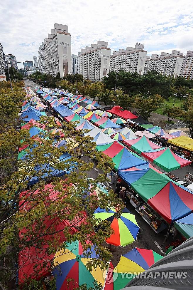 (광주=연합뉴스) 조남수 기자 = 추석을 열흘 앞둔 26일 광주 서구 치평동 상무시민로에 상무금요시장이 열려 있다. 2025.9.26