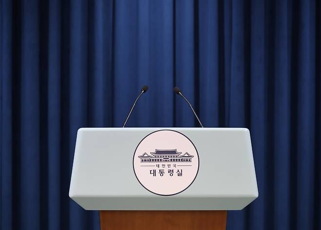 | ▲ 대통령실에 붙은 청와대 업무표장 6월 22일 용산 대통령실 기자회견장 연단에 청와대 시절 사용하던 업무표장이 붙어 있다. 대통령실은 지난 13일 보도자료를 통해 "과거 청와대에서 사용하던 업무표장을 다시 사용하기로 했다"며, "청와대 복귀가 완료될 때까지는 '청와대' 대신 '대통령실'로 글자를 변경해 사용하기로 했다"고 밝혔다. |