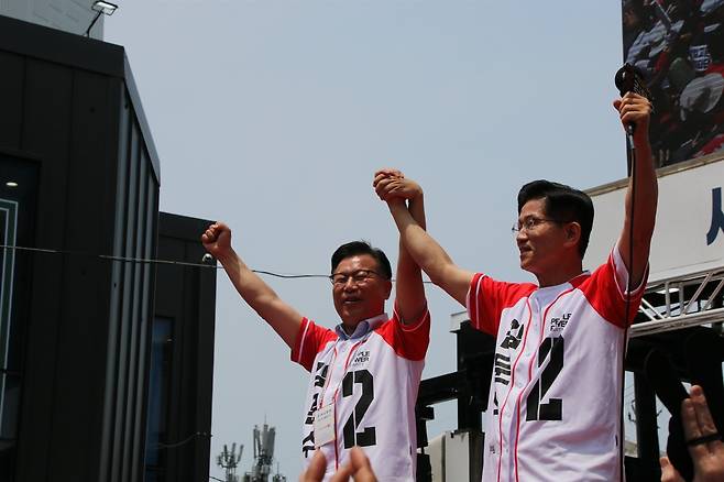 | ▲ 5월 31일, 이양수 국민의힘 의원(왼쪽)이 자신의 페이스북에 올린 김문수 당시 대선 후보와의 유세 현장 사진. |