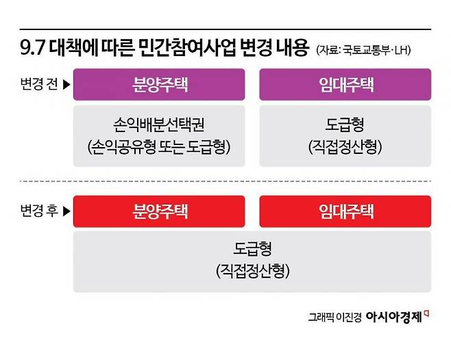민참은 LH가 민간 건설사와 공동으로 시행하는 사업으로 민간 기술력과 브랜드를 활용해 공공주택을 공급하는 방식이다. LH 아파트에 민간 브랜드가 들어간다. 기존에는 건설사가 '수익배분형'과 '도급형' 중 하나를 선택할 수 있었지만, 9·7 대책 이후 민참은 전면 도급형으로 바뀐다. 분양 수익을 나누는 수익배분형과 달리 도급형은 건설사에 시공이윤만 지급한다.